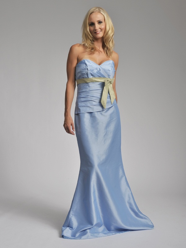 Excellent quality strapless taffeta made evening dress of light blue embellishments under bust